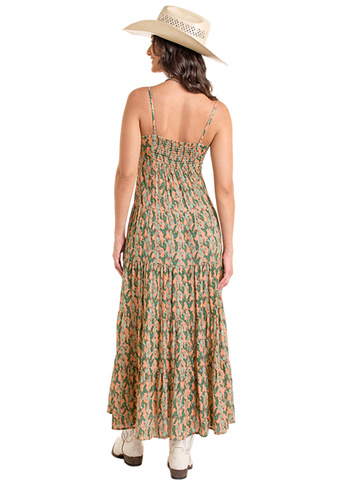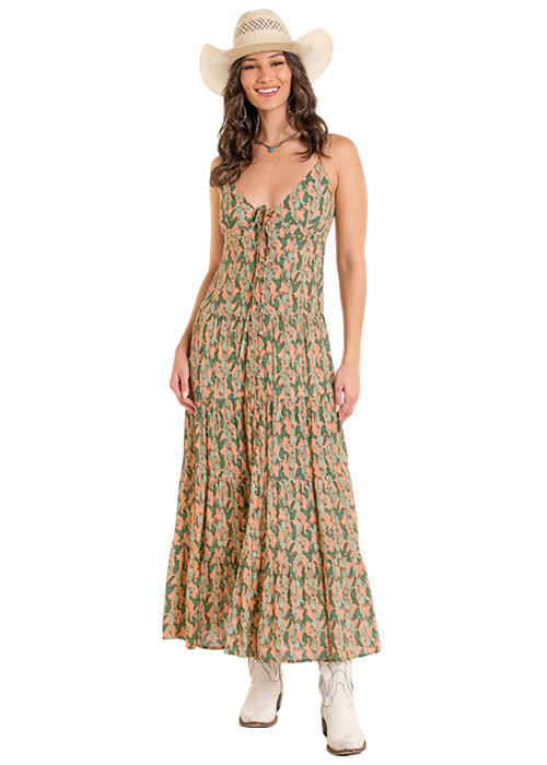 Style #BWD0R06286-Ladies Cactus Printed Maxi Dress-Rock and Roll Denim, Panhandle Ladies maxi dress with smocking back, slit in front, adjustable straps and a V at cleavage line. Tie front and...