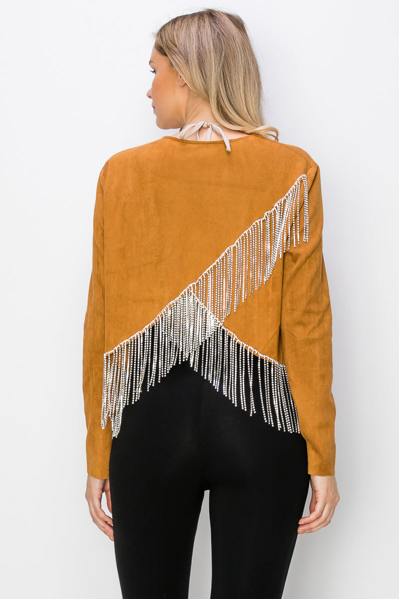 Style #IM2541LJ-Ladies LS Faux Suede w/Rhinestone Fringe-Vocal Apparel Ladies long sleeve faux suede knit open front jacket with rhinestone fringe along the hem and criss crossed on back. 92% polyester/8%...
