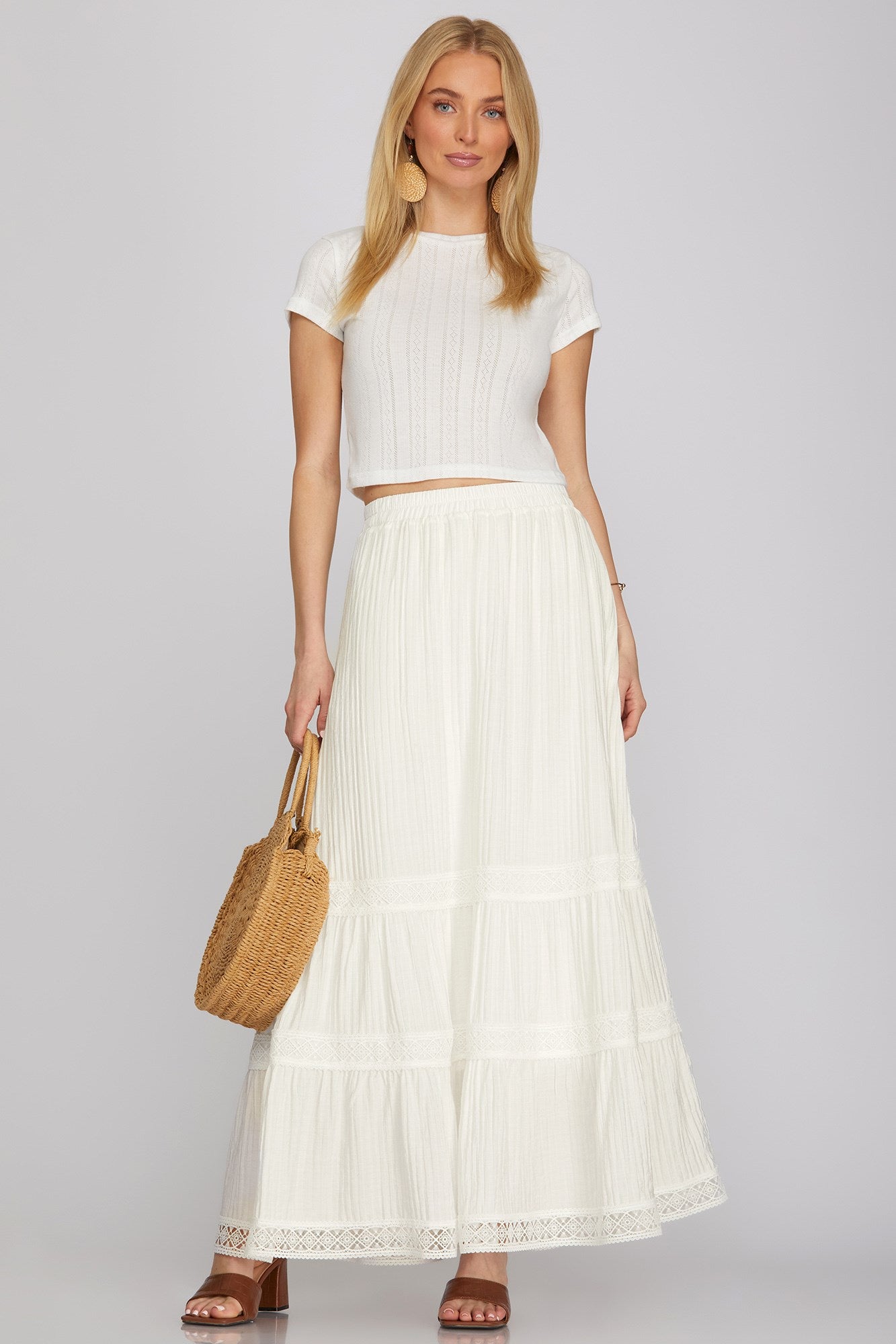 Style #ST1408-Maxi Skirt with Tiered Trim Lace and Pockets- She + Sky womens woven tiered trim lace white maxi skirt with side pockets. Full Lining white Skirt: 80% Rayon/20% Nylon...