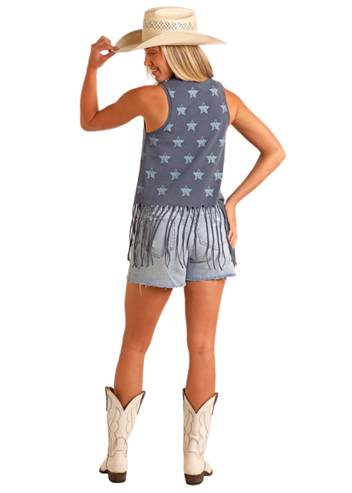 Style #BW20T05941-Ladies Graphic Tee with Fringe Hem-Rock & Roll Denim, Panhandle Ladies sleeveless top with graphic and fringe hem. Graphic "Howdy Y'all" . Star background on shirt 100% Cotton Machine...