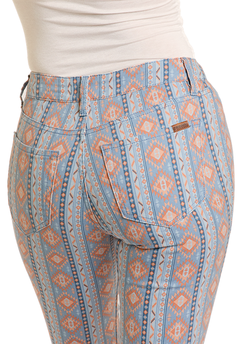 Style #BW6PD06325-Ladies Americana Button Flare Pants-Rock & Roll Denim, Panhandle Ladies flare, button, 2 back pockets, belt hoops. Americana aztec print. New flawless fit! Tummy Slimming, Flattering Fit Through the...