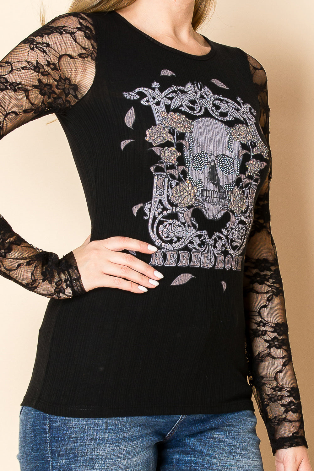 Style #22052L-Ladies Black Top w/Skull and Lace Sleeves-Vocal Apparel Ladies long sleeve ribbed knit top, graphic printed skull on front with embellishments and lace sleeves. "Rebel Rock" Sleeve: 70% Polyester/30%...
